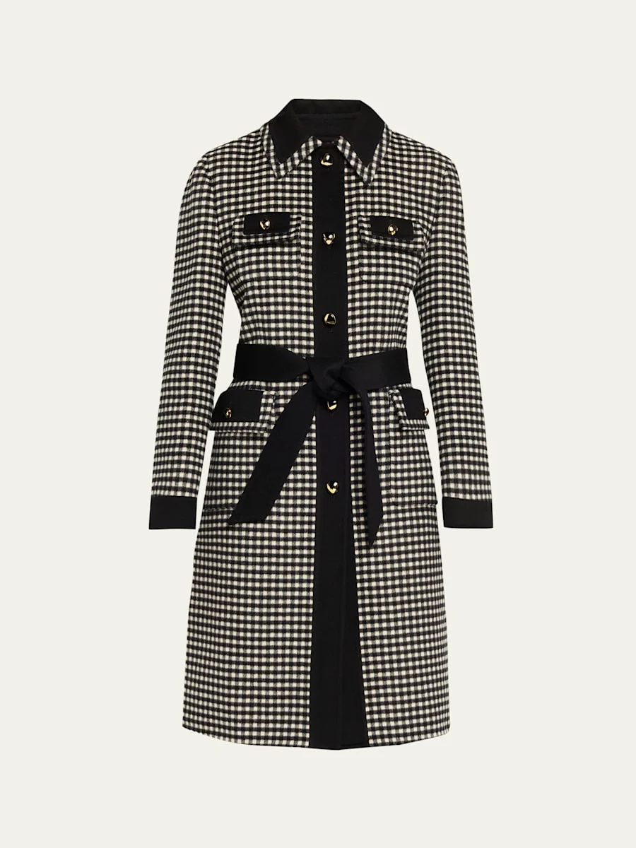 Valentino Garavani "Vichy" coat is crafted from virgin wool with a sharp black check pattern, contrast trim, and signature Vlogo buttons Point collar; singlebreasted front Long sleeves Selftie belted waist Chest and hip buttonflap pockets Straight fit Knee length Walking vent back Virgin wool Made in Italy