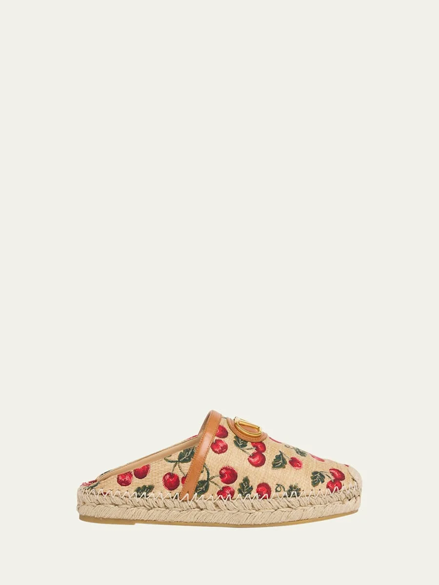 Valentino Garavani cherryprint cotton and raffia espadrille mules with leather trim and a golden V logo medallion. Flat braided jute heel. Round toe. Slide style. Leather lining. Leather sole. Made in Italy.