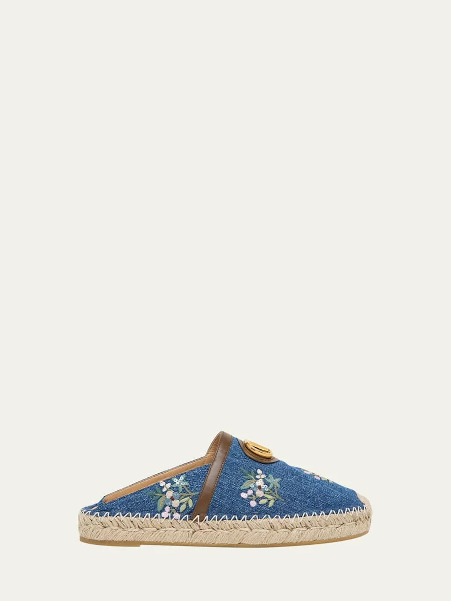 VLogo Floral-Embroidered Denim Espadrille Mules