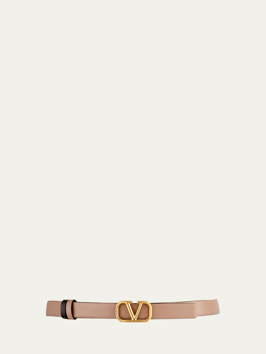 Valentino Garavani calfskin leather belt. Approx. 0.8"W (20mm). Golden VLOGO buckle. Made in Italy. Online Inquiries: BGS21_D41FU| Store Inquiries: #3214287
