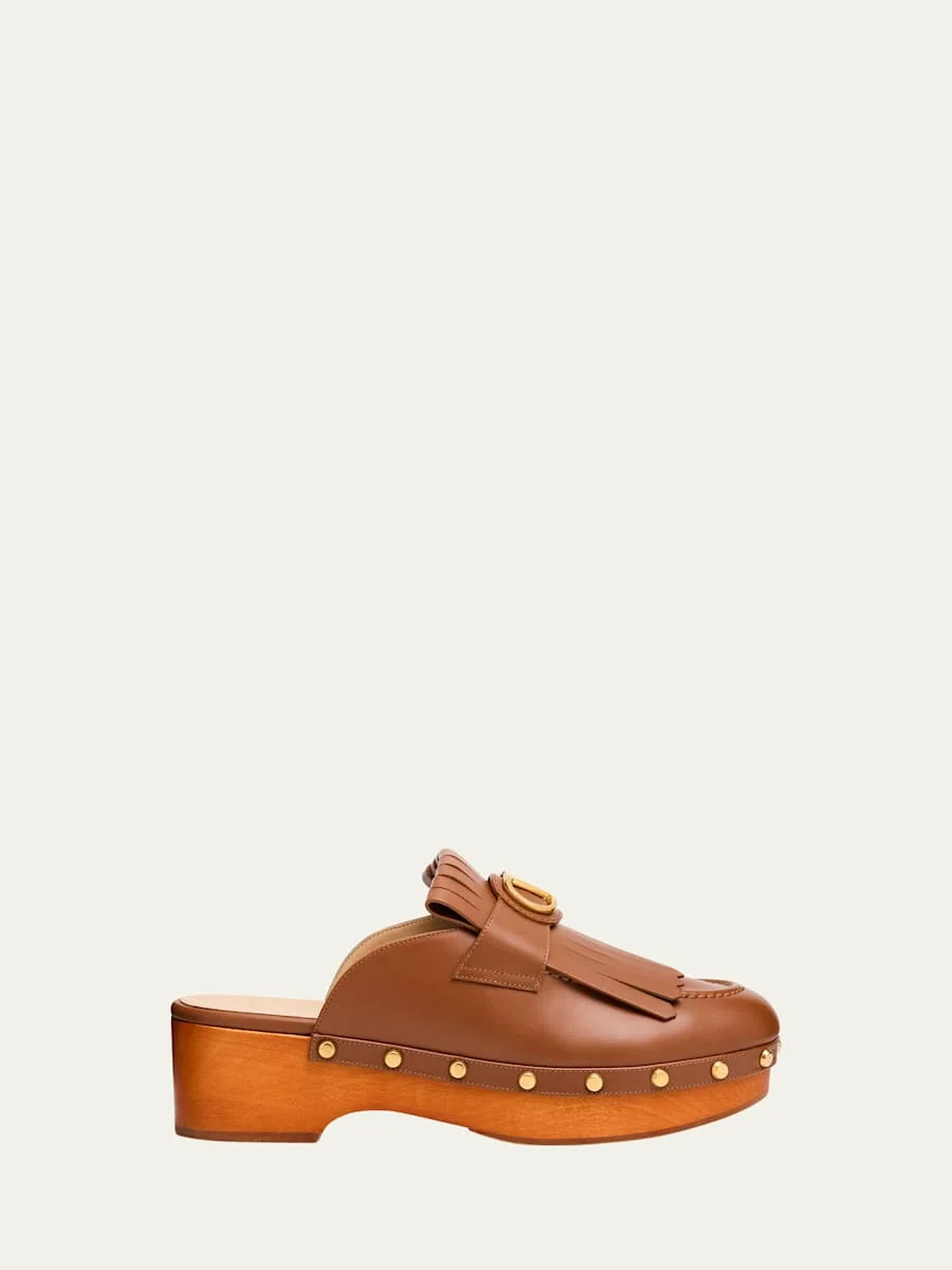 Valentino Garavani calf leather loafer mule clogs featuring a foldover kiltie fringe vamp, stud accented midsole, and a golden V logo medallion 1.75 in / 45 mm wooden wedge heel Round toe Notched vamp Easy slide style Lining: Goat leather Made in Italy Size Note: Valentino Garavani shoes run small. Please order a 1/2 size larger than you typically wear. Online Inquiries: BGS21_X6QPQ| Store Inquiries: #4888905