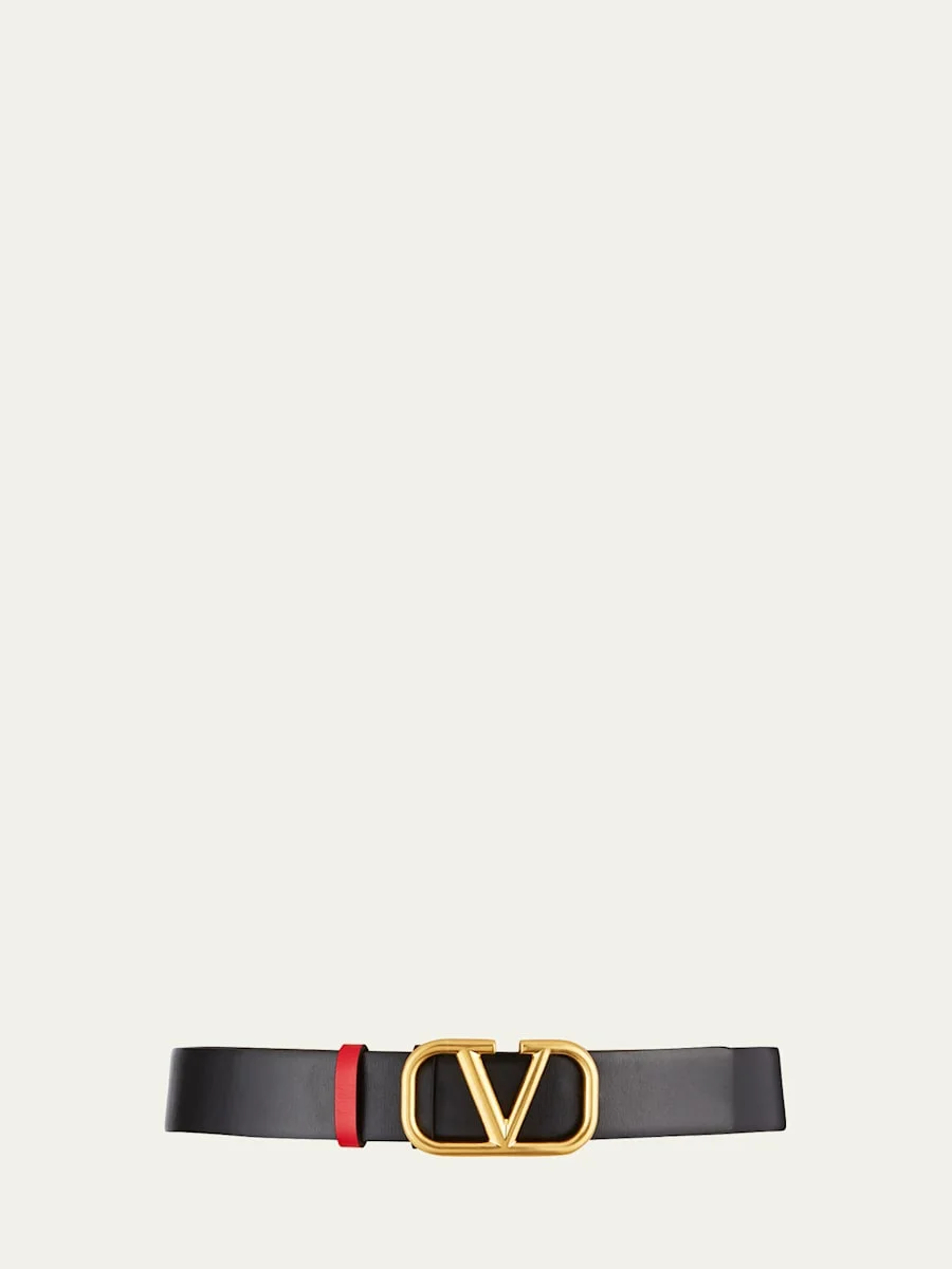 Valentino Garavani reversible calf leather belt. Approx. 1.1"W (3cm). Polished golden VLOGO buckle. Made in Italy. Online Inquiries: BGS21_D4QQY| Store Inquiries: #3214286