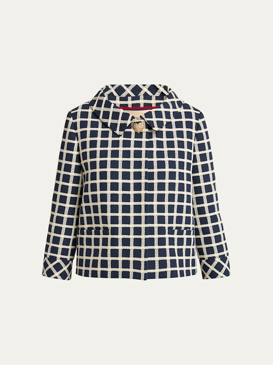 Valentino Garavani jacket in window check motif features a heart button detail embellished in crystals Spread collar Front closure with lined press studs Bracelet sleeves; button cuffs Welt pockets Straight fit Wool/cotton/nylon/polyamide Lining: Acetate/silk Made in Italy