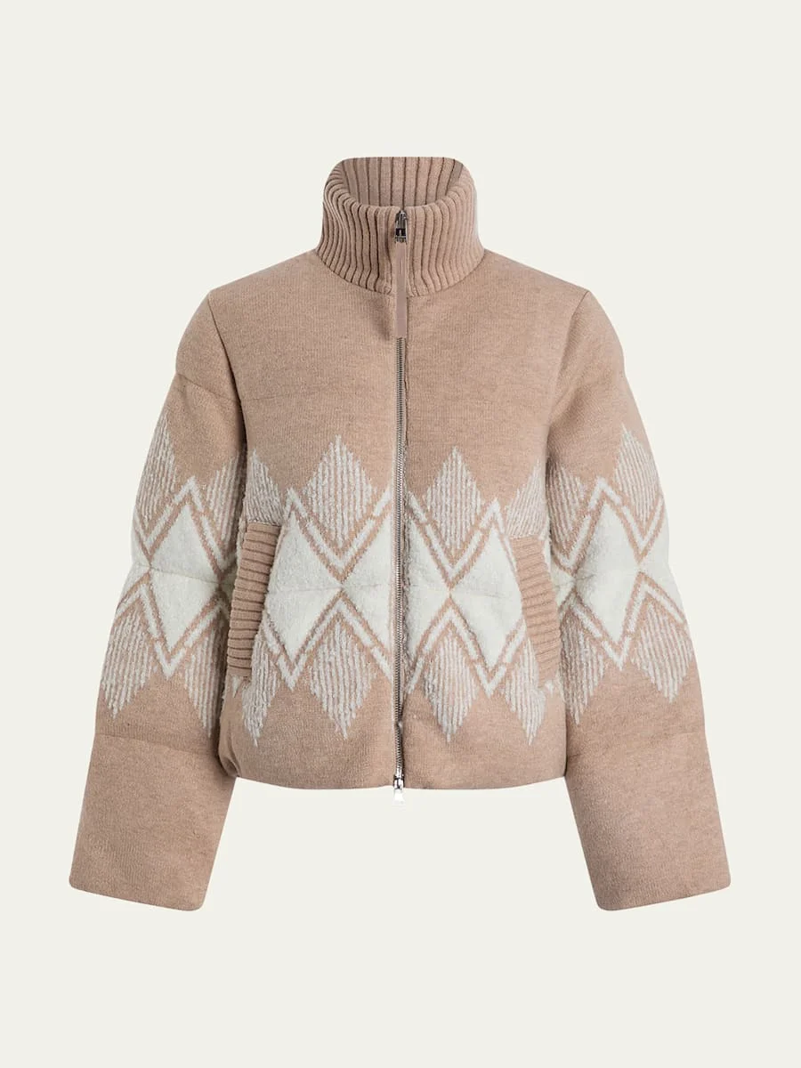Varley's "Belinda" puffer jacket offers a modern alpine design with boucle yarn in a diamond jacquard pattern Approx. 23.6"L from shoulder to hem High knitted neckline; twoway zip front Long sleeves with thumbhole cuffs; approx. 24"L Knitted welt pockets Classic fit Hip length Acrylic/pbt/nylon/polyamide Fill: Sorona® Dry clean Imported