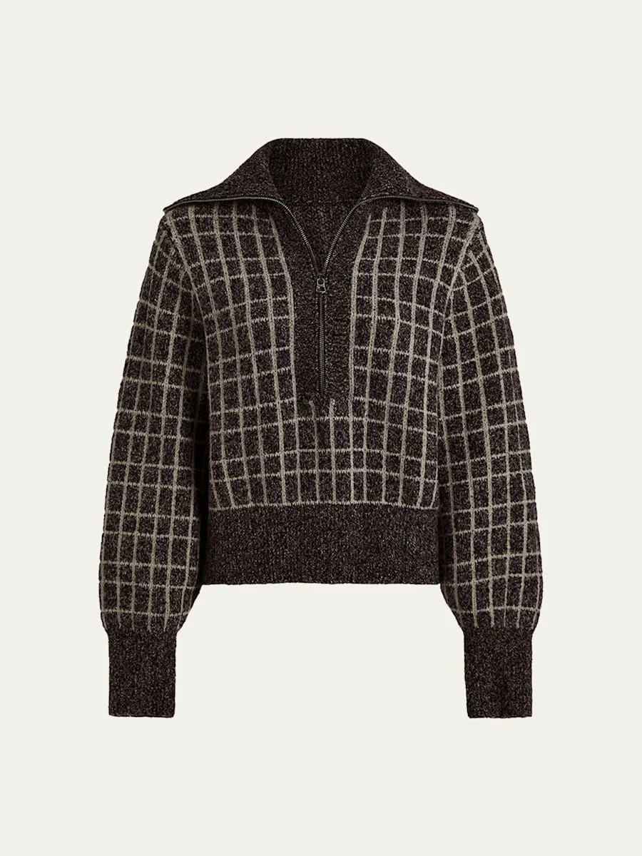 Crafted from a plush boucle jacquard in a classic checkered pattern, the "Furley" sweater by Varley offers a soft texture made for elegant layering Approx. 22.4"L from shoulder to hem Turnback collar; halfzip front Long sleeves Relaxed fit Hip length Pullover style Cotton Imported