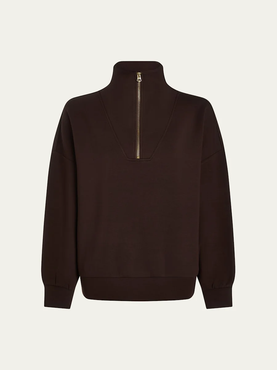 Varley "Hawley" sweatshirt in signature Doublesoft fabric features a paneled half-zip neck Stand collar Dropped shoulders Long sleeves Relaxed fit Banded cuffs and hem Pullover style Viscose/polyester/elastane Imported Online Inquiries: BGS21_T8U5M| Store Inquiries: #4553150