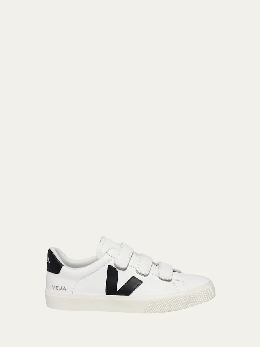 VEJA "Recife" leather low-top sneakers with contrast logo and collar. 1" flat heel. Round toe. Triple grip strap vamp. Cushioned footbed. Recycled polyester lining. Rubber sole. Made in Brazil. Online Inquiries: BGS21_X5D9M| Store Inquiries: #4073066