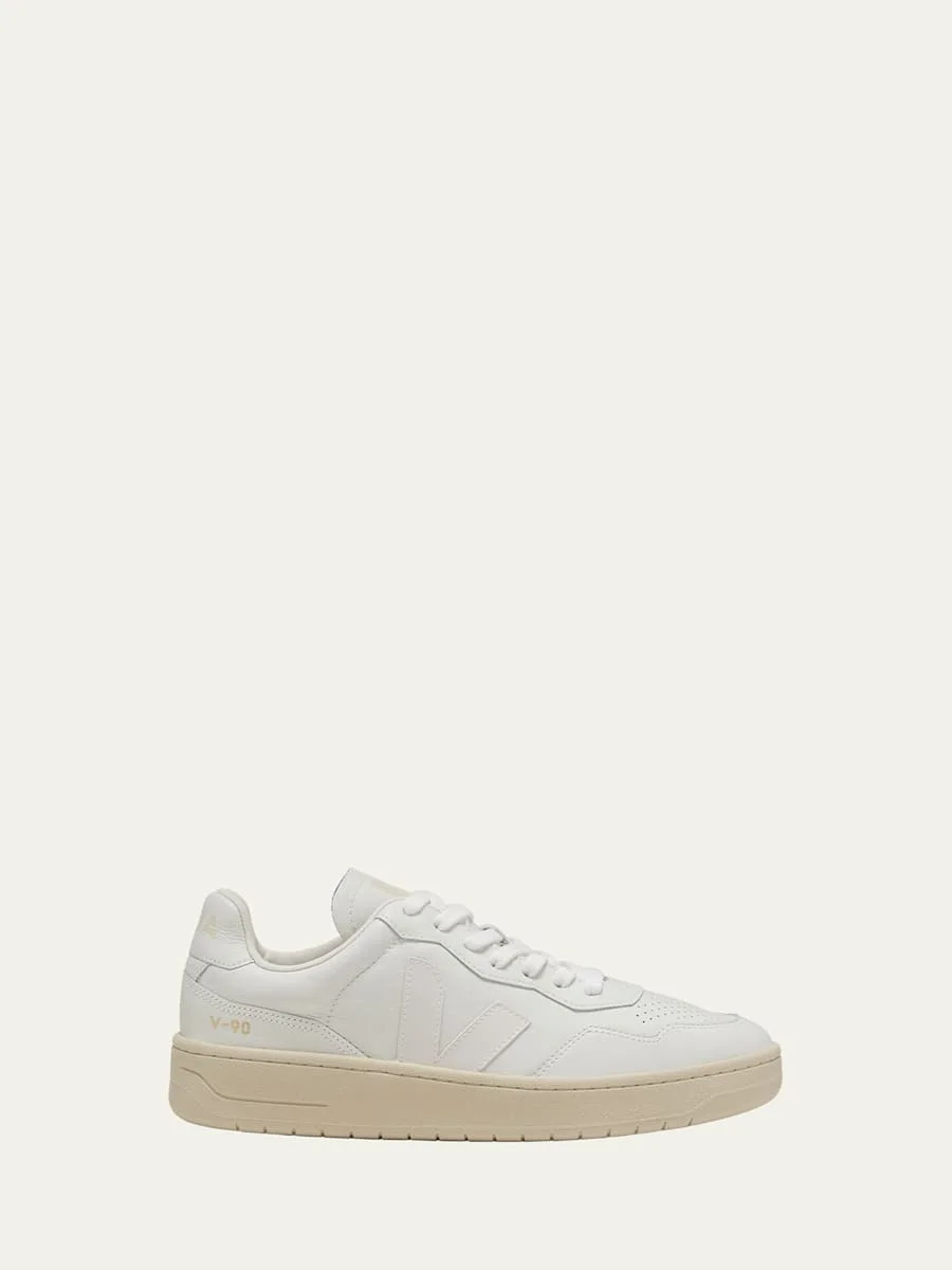 VEJA "V-90" leather and rubber sneakers with signature V logo across sides Flat heel Perforated round toe Lace-up vamp Logo on heel-tab Rubber outsole Lining: Recycled polyester Hand wash Made in Brazil Online Inquiries: BGS21_X7EZP| Store Inquiries: #4673578