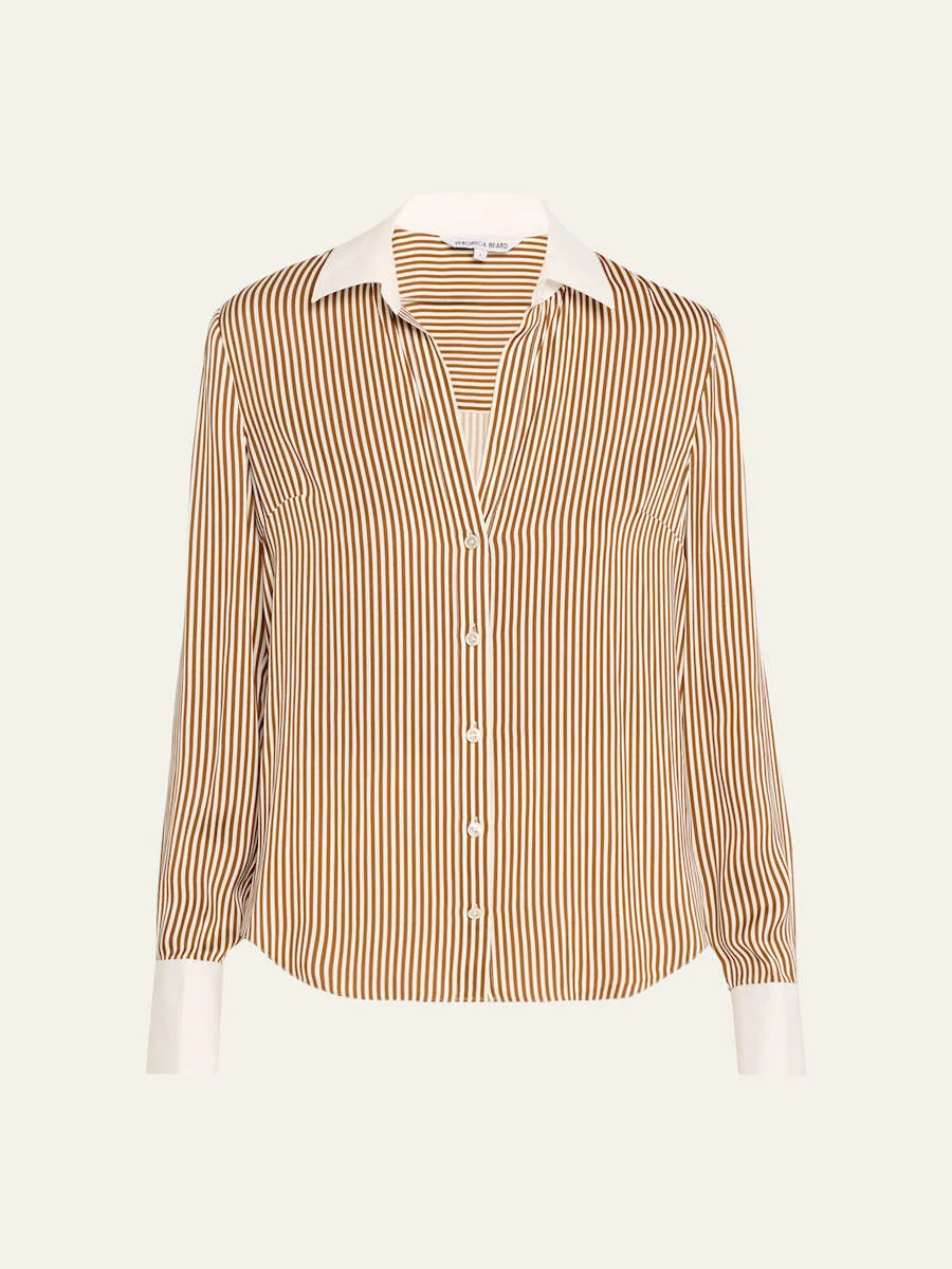 Veronica Beard "Amelia" stripe silk-blend shirt with contrast trim Point collar; V neckline Long sleeves with button cuffs Classic fit Hem falls to the hip Button-front Silk/viscose/elastane Imported Online Inquiries: BGS21_T6B2U| Store Inquiries: #4950913
