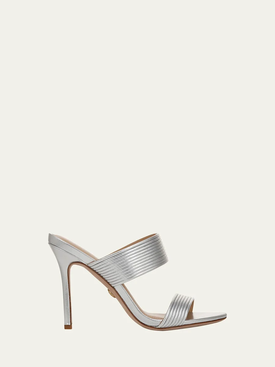 Veronica Beard "Asha" metallic grid leather mule sandals 4.00 in / 100 mm stiletto heel Open toe Dual band upper Slide style Leather outsole Lining: Leather Professional cleaning recommended Imported Online Inquiries: BGS21_X6RSW| Store Inquiries: #4915925