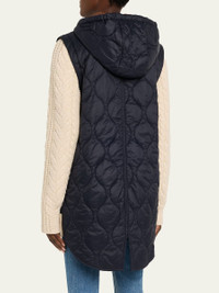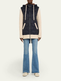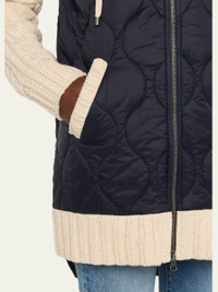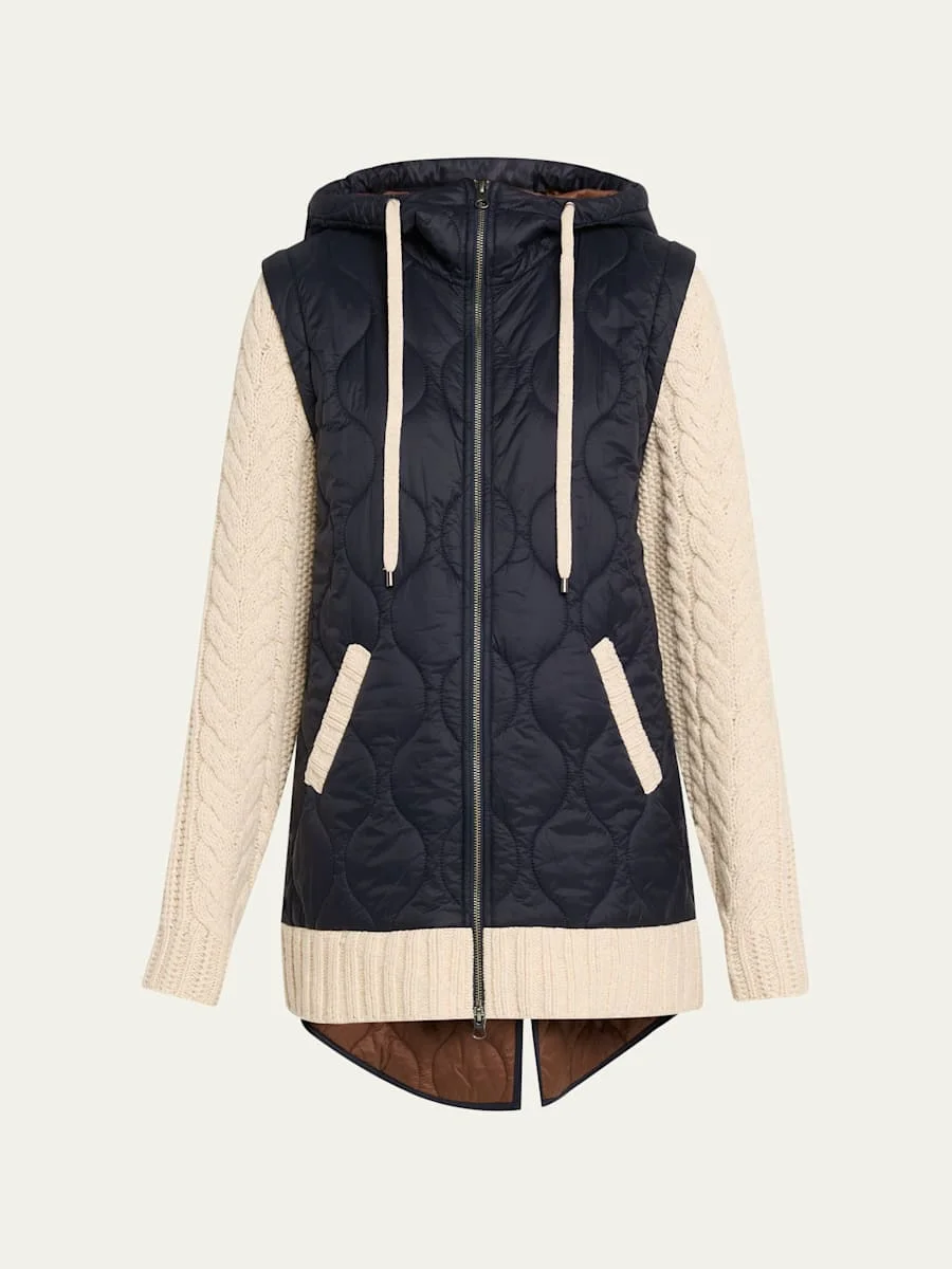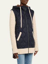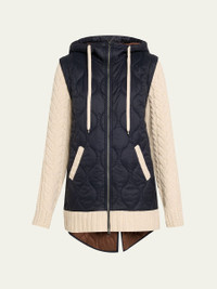 Featuring a quilted nylon body, the "Barrows" mixedmedia jacket by Veronica Beard is elevated with cableknit wool sleeves and trim for a contrasting finish that is warm and comfortable Hooded drawstring neckline Long sleeves Angled slip pockets Relaxed fit Elongated highlow hem Twoway zipfront Nylon/polyamide/wool Dry clean only Imported