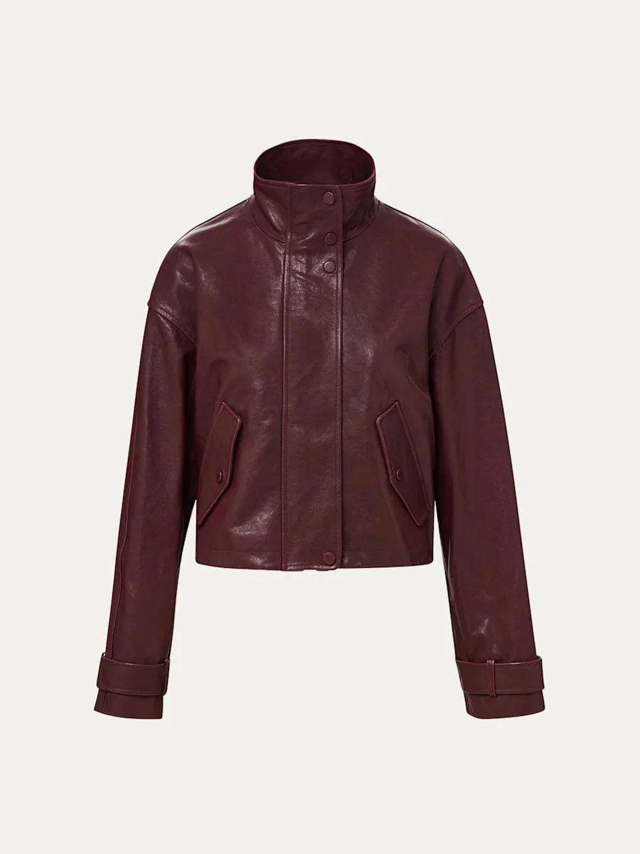 Crafted in a rich burgundy lambskin leather, the "Bateman" jacket by Veronica Beard features a cropped silhouette with an adjustable drawcord hem for a modern finish. Funnel neckline; zip-front with snap-over placket Dropped shoulders Long sleeve with belted cuffs; approx. 33"L Relaxed, oversized fit Angled flap pockets Leather Lining: Viscose Professional cleaning recommended Imported Online Inquiries: BGS21_T8RA5| Store Inquiries: #5363922