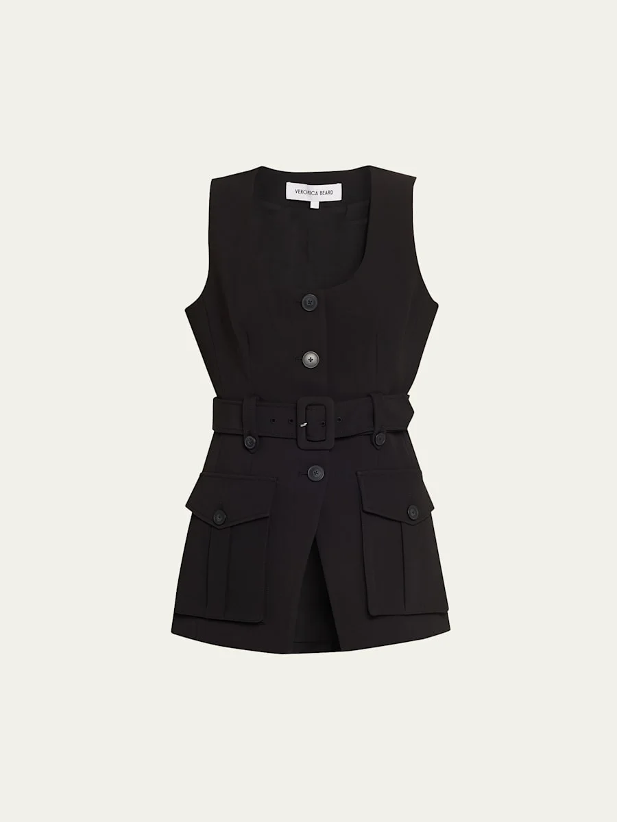 Utility-inspired vest by Veronica Beard. Scoop neckline Sleeveless Adjustable belt Hip flap pockets Tailored fit Cut-away hem Button-front Polyester/elastane Lining: Polyester Dry clean Imported Online Inquiries: BGS21_T7TT9| Store Inquiries: #5203176