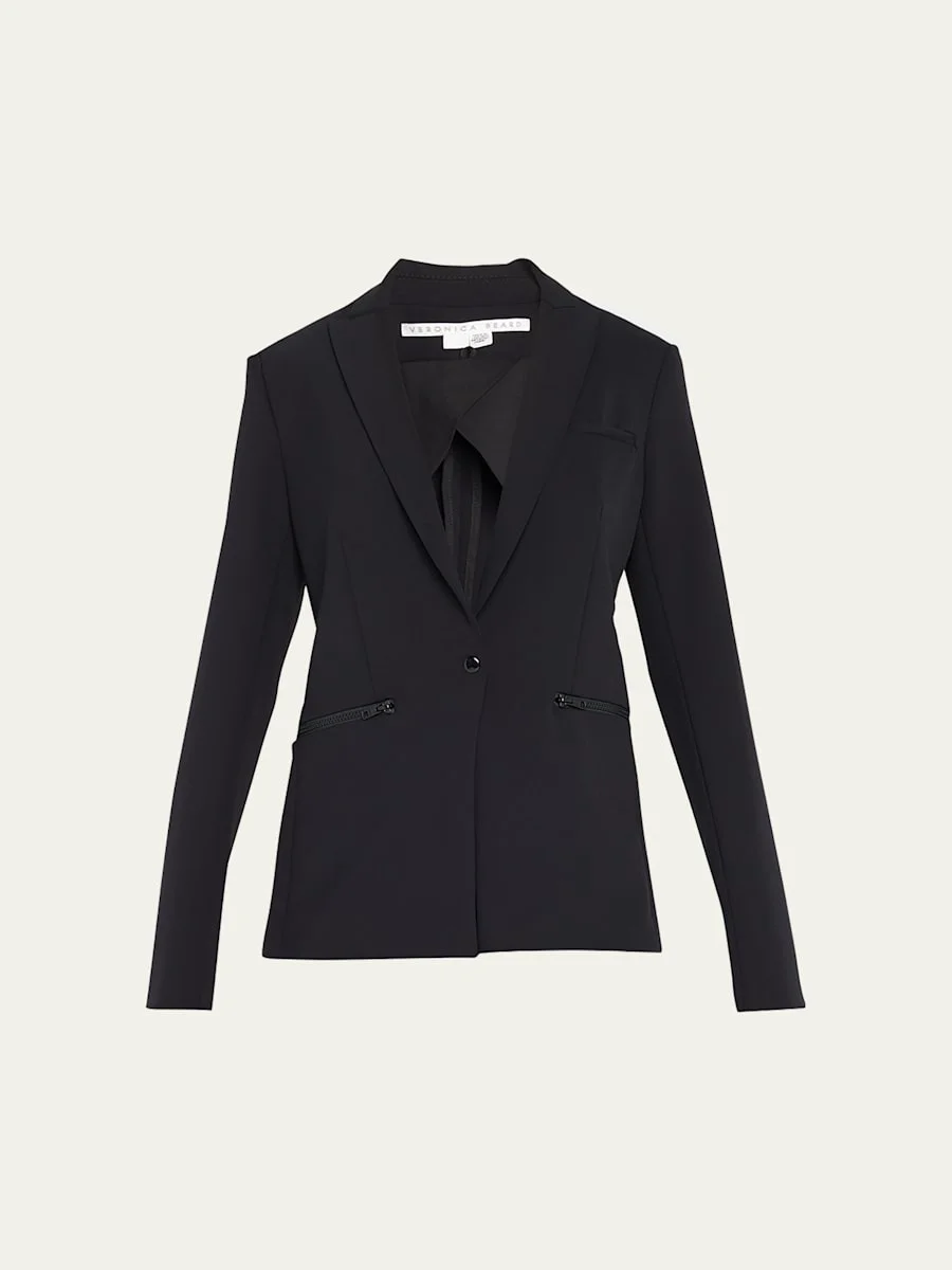 Veronica Beard jacket in bistretch scuba. Approx. 26"L down center back. Notched collar; single snap front. Long sleeves; foursnap cuffs. Princess seams on front. Welt pocket at chest. Zip pockets at waist. Straight vented hem. Polyester/spandex. Dry clean Made in USA of Italian material.