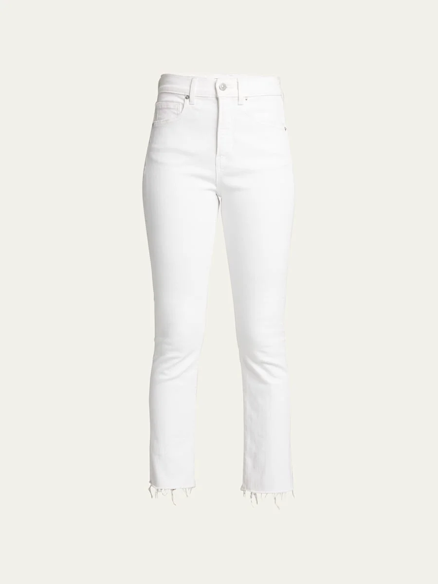 Veronica Beard Jeans "Carly" jeans in stretch denim Approx. measurements: 11.3" rise; 26" inseam; 26" outseam Fivepocket style High rise Slim fit; narrow flare from the knee Cropped at the ankle Frayed rawedge hem Button/zip fly; belt loops Cotton/polyester/spandex Machine wash Made in USA from imported materials Size Note: Height: 5'9"/ waist 24"/ hips 36"/ bust 32" Model is wearing size 25