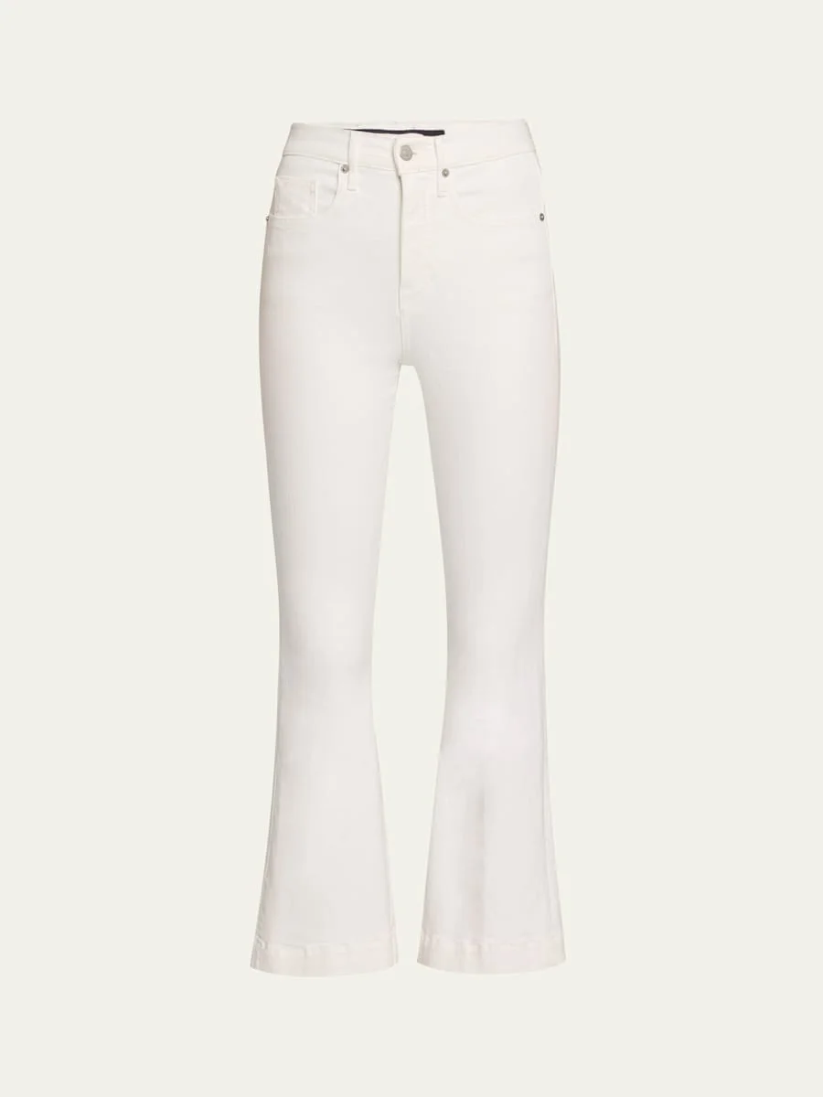 Veronica Beard "Carson" flare jeans in white denim High rise Five-pocket style Fitted through the hip and thigh Ankle length Button/zip fly; belt loops Cotton/polyester/polyurethane Made in USA Model is 5'10"/177cm. Online Inquiries: BGS21_T5NEZ| Store Inquiries: #4778585