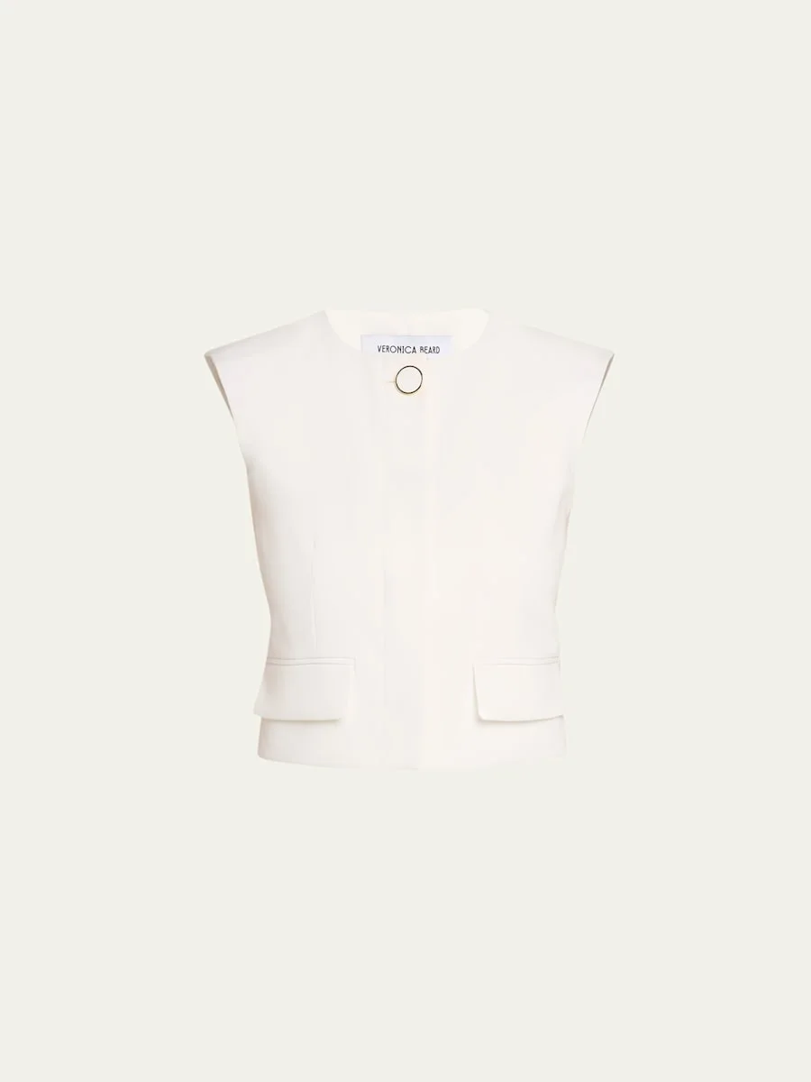 Cut from crisp Japanese crepe, the "Cliffwood" vest by Veronica Beard boasts a polished, cropped silhouette secured with a single bezelset button. Round neckline Sleeveless Flap pockets Boxy fit Hidden front closure Triacetate/polyester Dry clean Imported SIZE amp; FITModel measurements: 5'10" tall Model is wearing a US size 4/Small