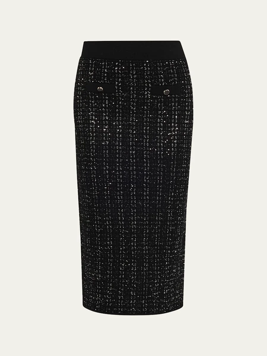 Veronica Beard "Corbin" midi skirt knitted in a sparkly check motif High rise Elastic waistband Front welt pockets Pencil style Hem falls below the knee Pullon style Acetate/elastane Unlined Dry clean Imported