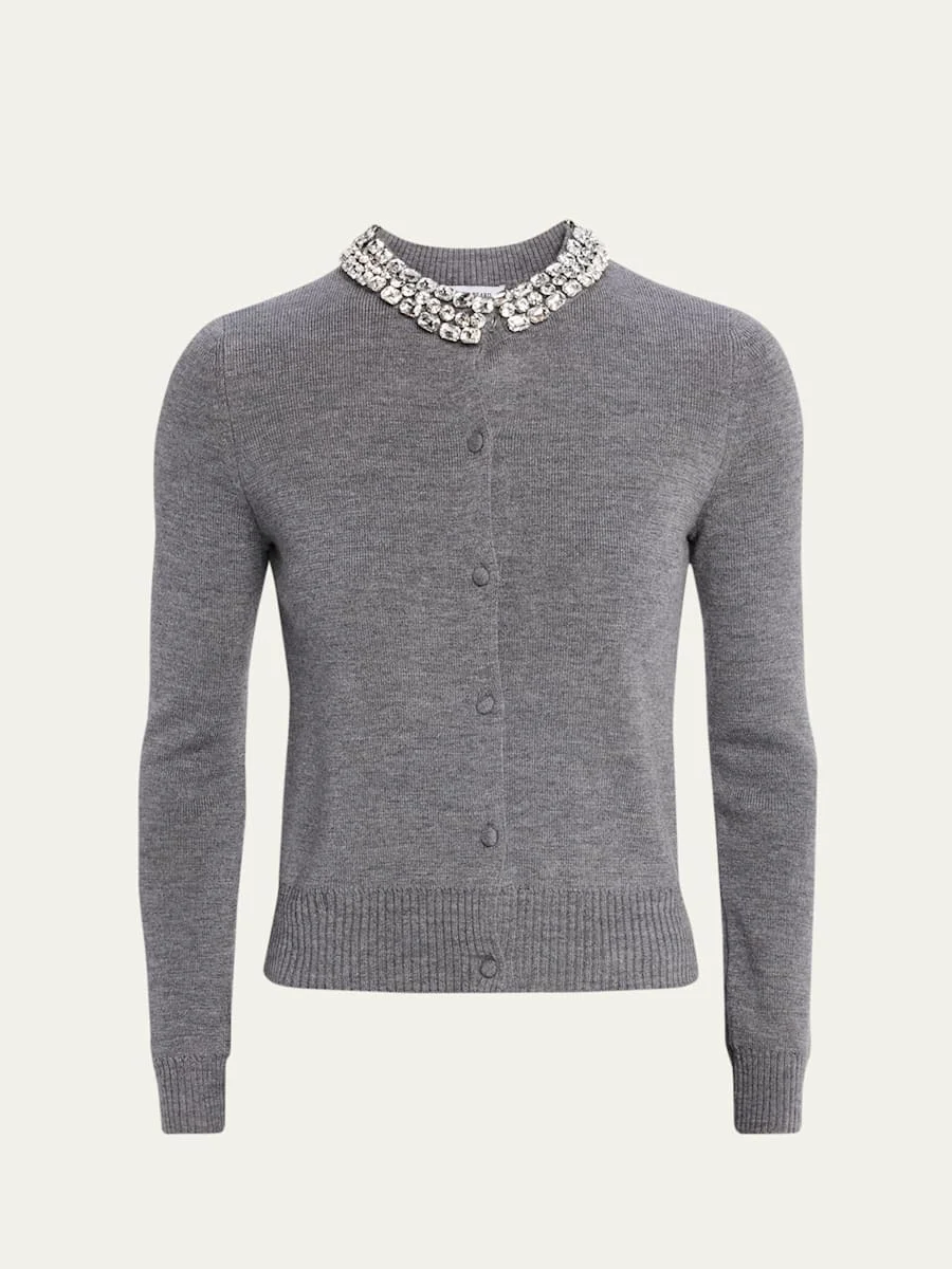 Knitted in soft merino wool, the "Daro" cardigan by Veronica Beard boasts a crystalembellished neckline for a glamorous finish. Crew neckline Long sleeves; approx. 29.5"L Classic fit Hem sits at the hip Buttonfront Merino wool Dry clean Imported