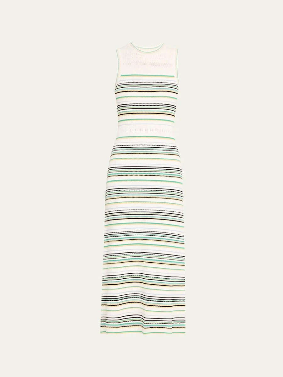 Veronica Beard "Dawna" stripe ribbed-knit midi dress Crew neckline Sleeveless A-line silhouette Hem falls below the knee Slipover style Viscose/polyester Dry clean Imported Online Inquiries: BGS21_T6WZP| Store Inquiries: #5021402