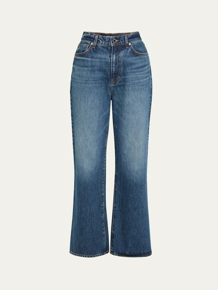 Veronica Beard "Dylan" jeans in faded darkwash denim Approx. 11.5" rise; 27" inseam High rise Fivepocket style Straight legs with a subtle flare Ankle length Button/zip fly; belt loops Cotton Machine wash cold Made in USA
