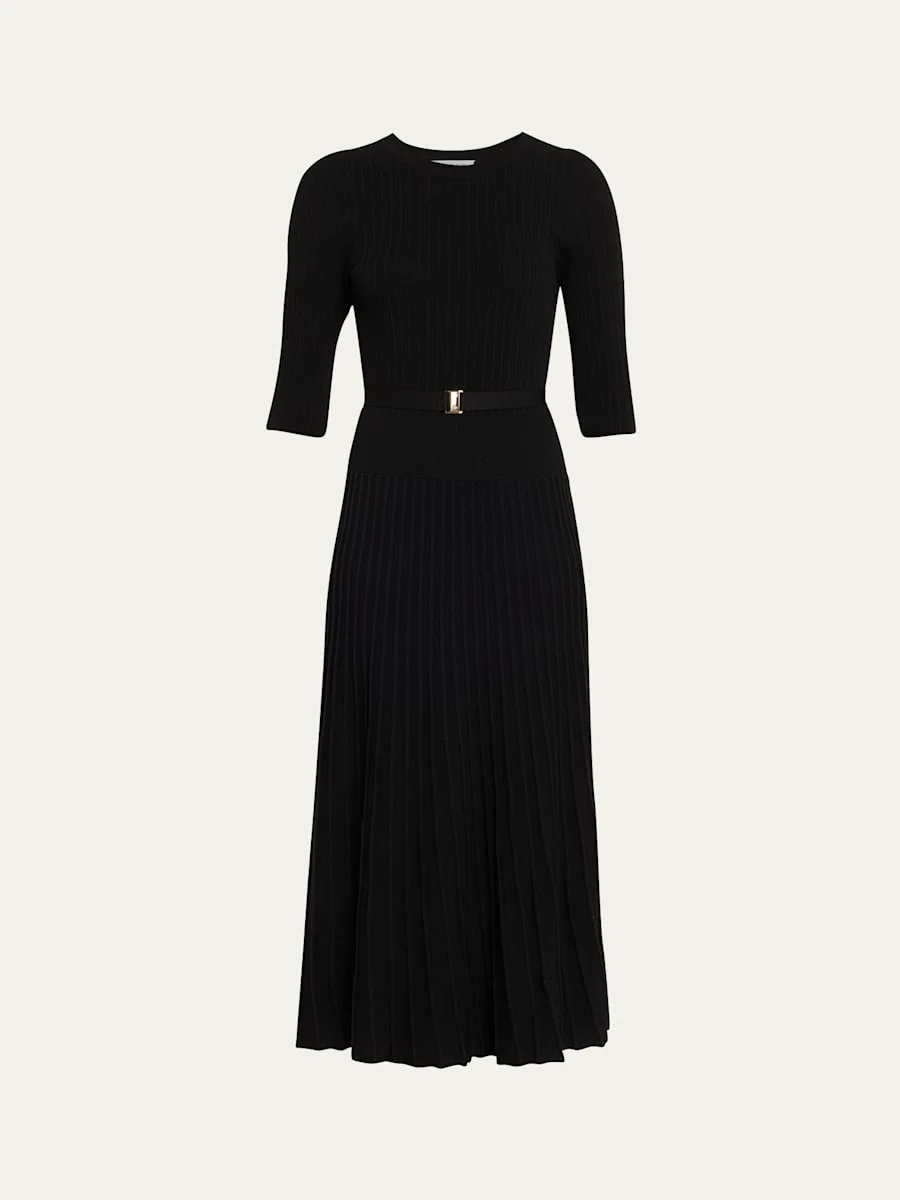 Finished with a belted waist, the "Elthea" midi dress by Veronica Beard is cut from ribbed knit and offers a sleek, elongating silhouette that can be paired with heels or boots for a versatile look. Crew neckline Elbow-length sleeves A-line silhouette Hem falls below the knee Slipover style Viscose/polyester Dry clean only Imported Online Inquiries: BGS21_T8QX2| Store Inquiries: #5360521