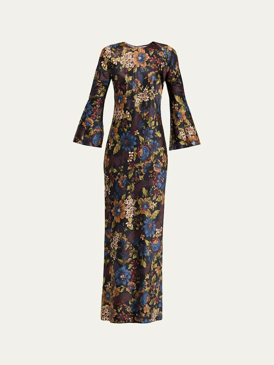 Featuring a vibrant floral print, the "Gemma" maxi dress by Veronica Beard is crafted from a luxurious silk blend that exudes elegance. Crew neckline Long flared sleeves; approx. 31.3"L Column silhouette Full length Center back zip Silk/viscose/elastane Unlined Dry clean Imported