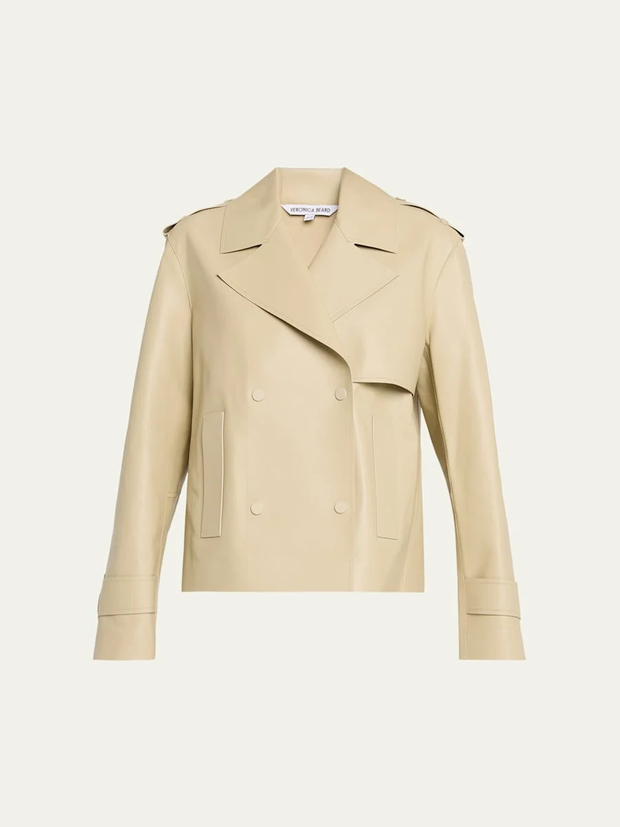 This "Heathcliff" trench coat from Veronica Beard is cut from supple lambskin leather in a cropped, modern silhouette Peak lapels Doublebreasted snap front Shoulder epaulettes Long sleeves Snap tab cuffs Front gun flap Side welt pockets Hip length Straight fit Leather Dry clean Imported