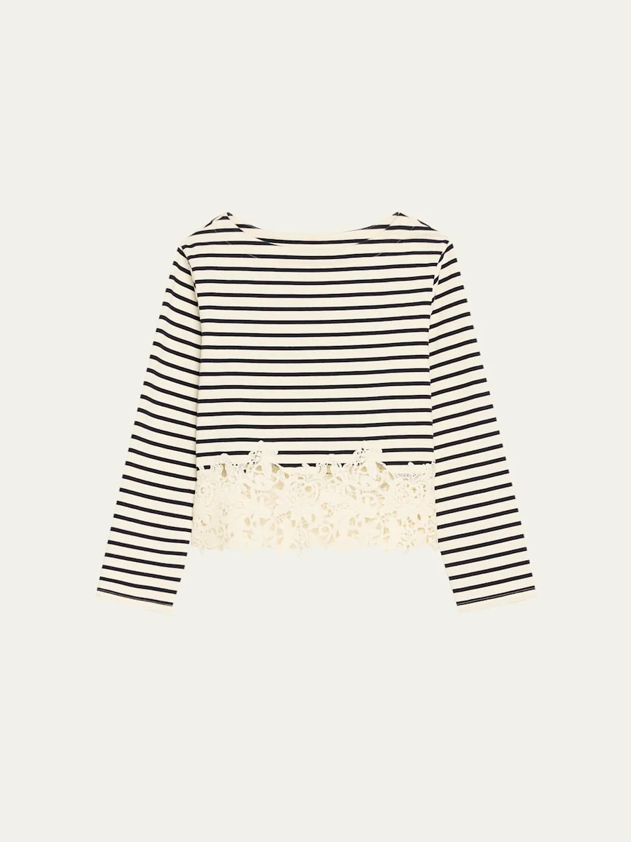 Finished with floral crochet lace, the "Hovey" top by Veronica Beard is crafted from ultrasoft cotton jersey and boasts a stripe motif with nautical inspiration. Boat neckline Long sleeves Classic fit Hem sits at the hip Pullover style Cotton Machine wash cold Imported SIZE amp; FITModel measurements: 5'10" tall Model is wearing a US size 4/Small