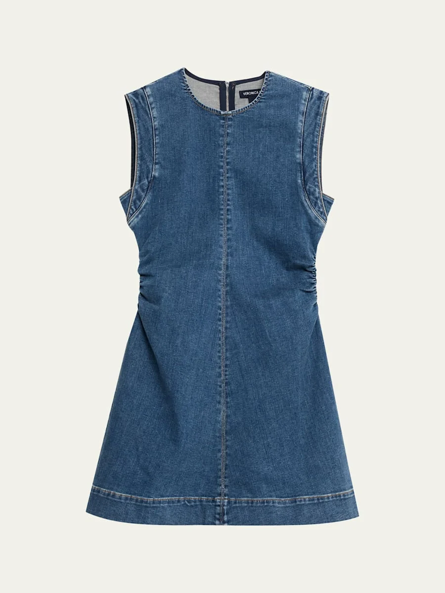 Veronica Beard "Imara" denim mini dress accented with side gathering that define the waist Crew neckline Sleeveless Slim silhouette Hem falls above the knee Exposed back zip Cotton/polyester/spandex Machine wash cold Imported SIZE amp; FITModel measurements: 5'10" tall Model is wearing a US size 4/Small