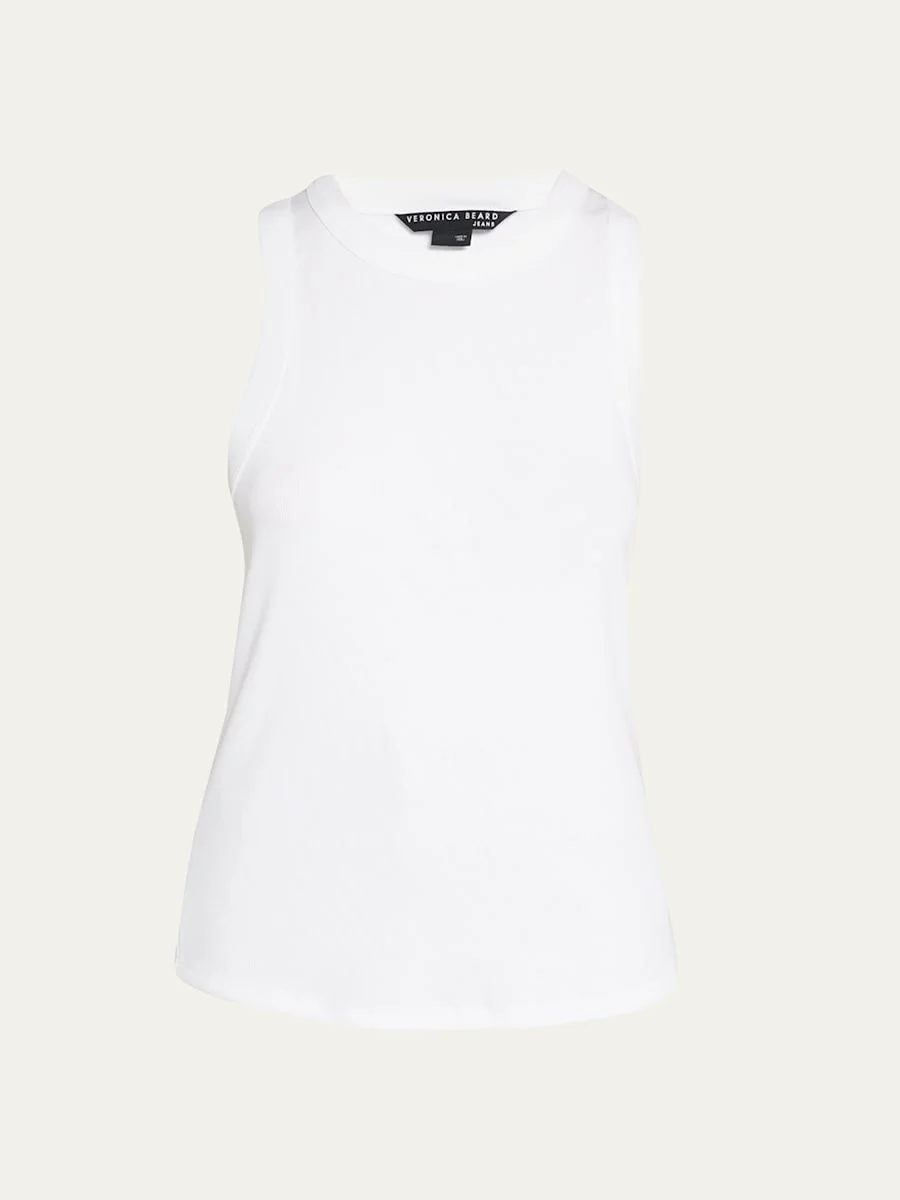 Veronica Beard "Jordyn" rib-knit tank top Crew neckline Sleeveless Racerback Slim fit Pullover style Cotton/elastane Made in Peru Model is 5'10"/177cm. Online Inquiries: BGS21_T4E9C| Store Inquiries: #4477002