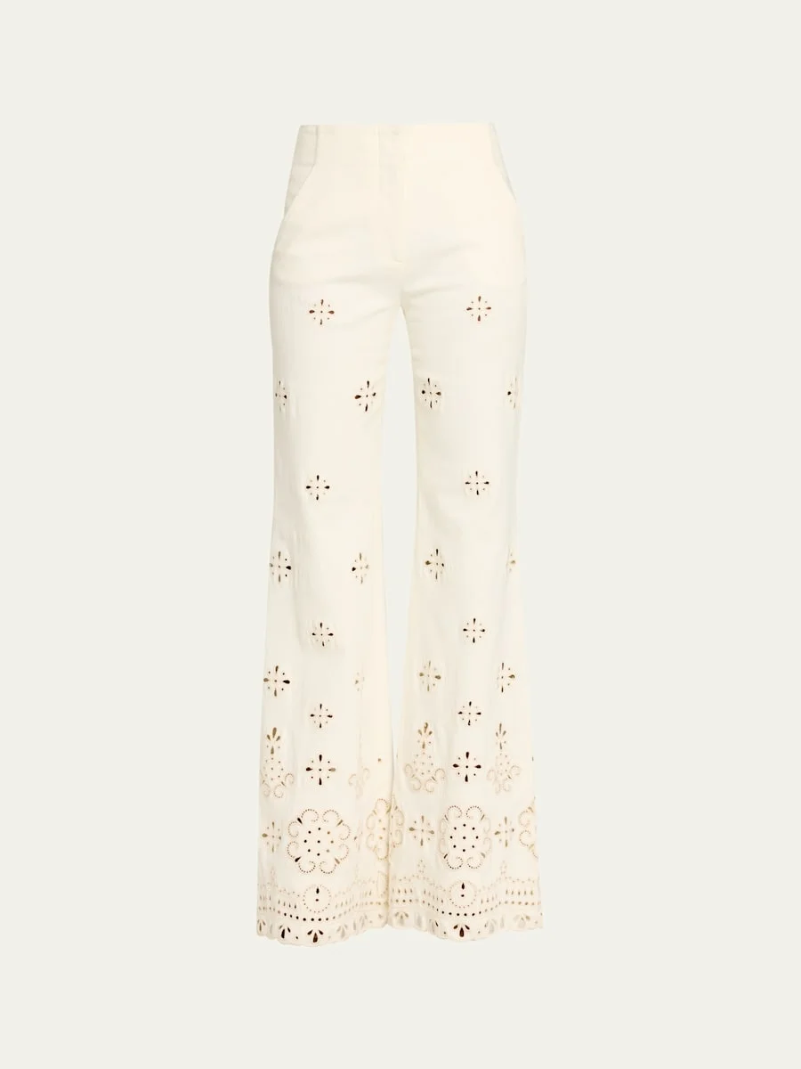 Veronica Beard's "Komi" pants are expertly tailored from stretch cotton twill with intricate custom eyelet detailing down each leg Approx. 10.4" rise; 30" inseam Highrise waistband Side slant pockets Back welt pockets Full length Flared legs Hidden hook/zip fly Cotton/elastane Lining: Polyester Imported SIZE amp; FITModel measurements: 5'10" tall Model is wearing a US size 4/Small