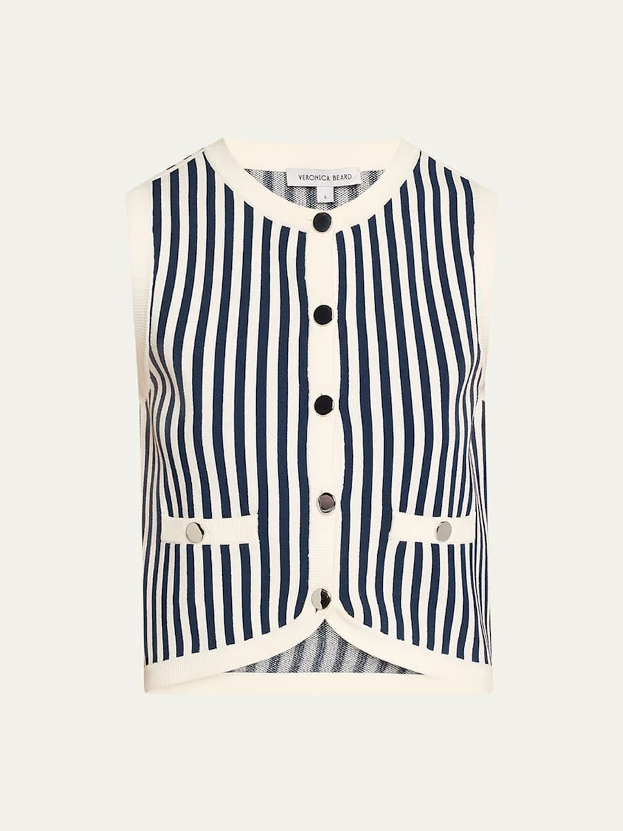Veronica Beard "Leland" striped vest finished with silvertone buttons Round neckline Sleeveless Faux welt pockets Cropped fit Buttonfront Viscose Dry clean Imported