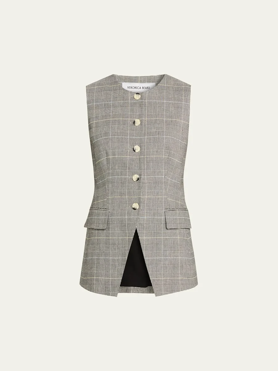 Veronica Beard "Lois" singlebreasted vest crafted from a plaid linenblend Round neckline Sleeveless Hip flap pockets Tailored fit Cutaway hem Back vent Buttonfront Linen/viscose/elastane Dry clean Made in USA