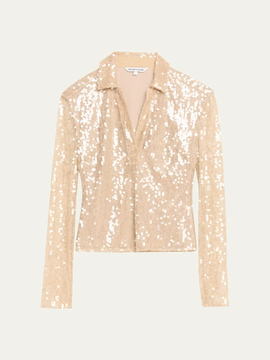 Veronica Beard "Meryl" top adorned with shimmering sequinembellishment Point collar; split V neckline Long sleeves Slim fit Hem sits at the hip Pullover style Nylon/polyamide/metallic fibers Dry clean Imported SIZE amp; FITModel measurements: 5'10" tall Model is wearing a US size 4/Small