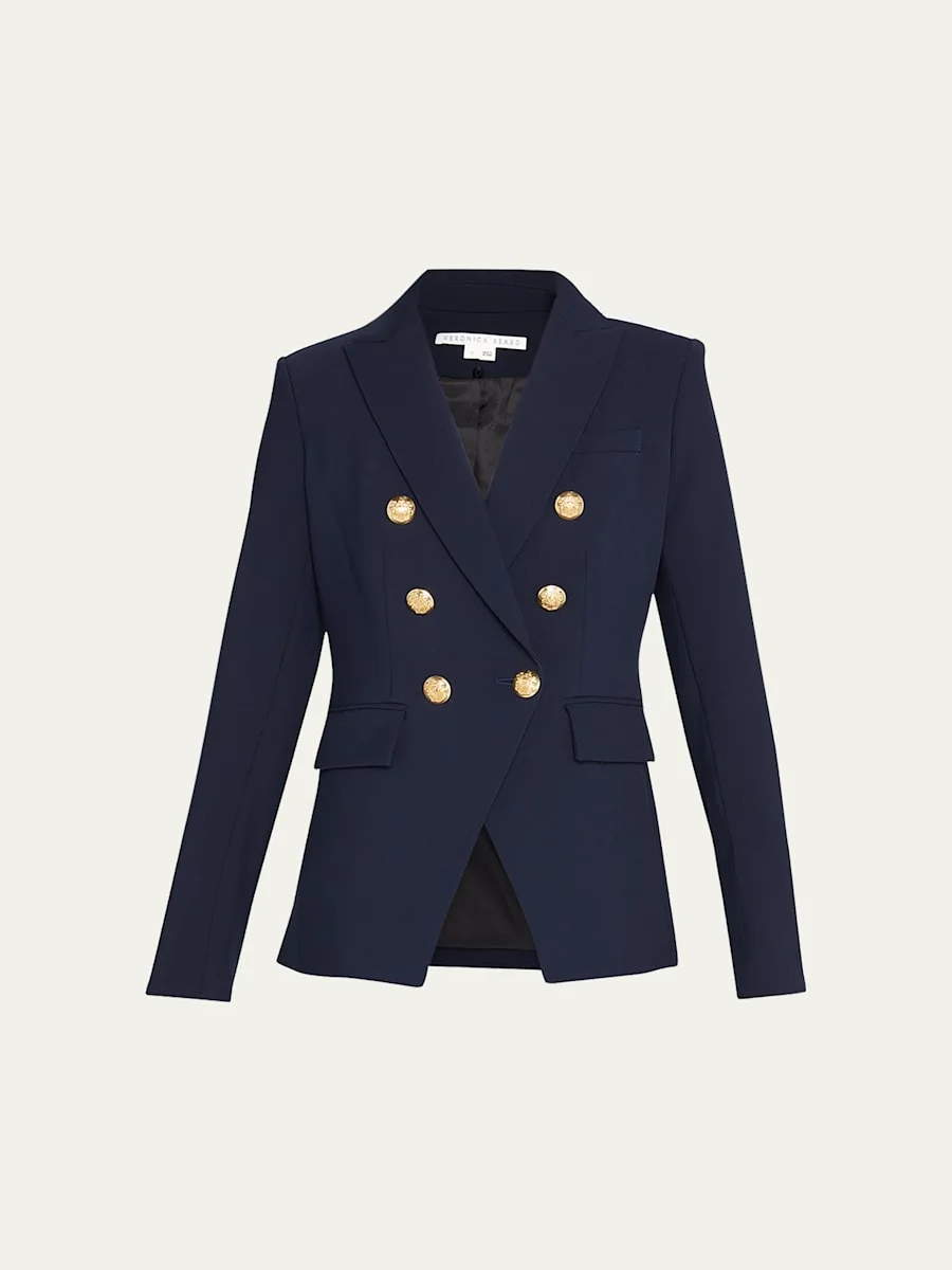 Veronica Beard "Miller" dickey jacket. Approx. measurements: Sleeve length 32 3/4"; Length 26" Compatible with all Veronica Beard dickeys (sold separately). Peak lapels; doublebreasted front. Long sleeves; button cuffs. Chest welt pocket. Side flap pockets. Tailored fit. Vented back. Polyester. Professional dry clean only Made in the USA