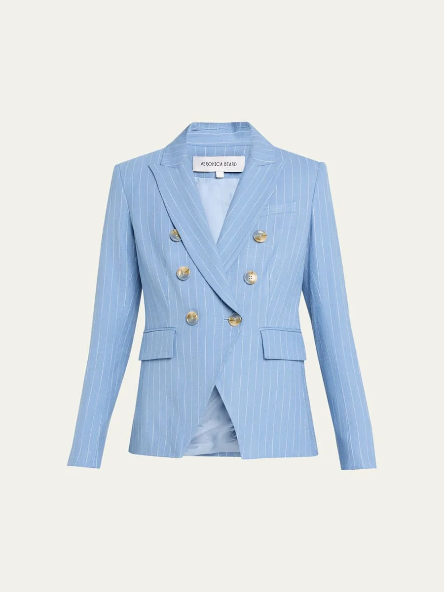 Veronica Beard "Miller" dickey jacket detailed with a classic pinstripe design Compatible with Veronica Beard dickey's (sold separately) Notch lapels Doublebreasted front Long sleeves with button cuffs Chest welt pocket Hip flap pockets Slim fit Cutaway hem Center back vent Buttonfront Viscose/elastane Lining: Viscose Dry clean only Made in USA from imported materials SIZE amp; FITModel measurements: 5'10" tall Model is wearing a US size 4/Small
