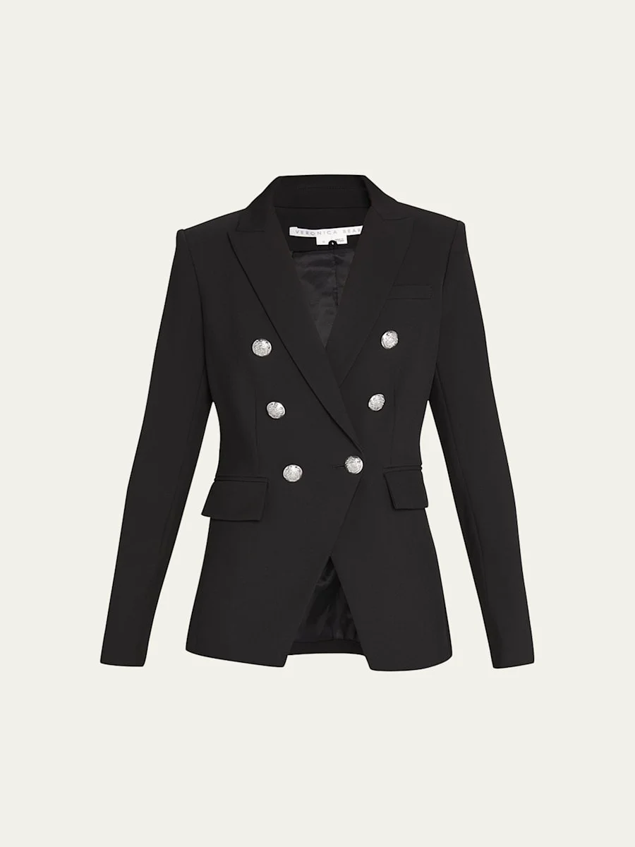 Veronica Beard "Miller" dickey jacket. Approx. measurements: Sleeve length 32 3/4"; Length 26" Compatible with all Veronica Beard dickeys (sold separately). Peak lapels; doublebreasted front. Long sleeves; button cuffs. Chest welt pocket. Side flap pockets. Tailored fit. Vented back. Polyester. Professional dry clean only Made in the USA