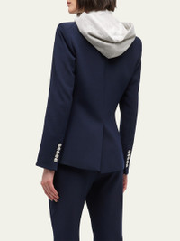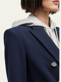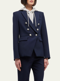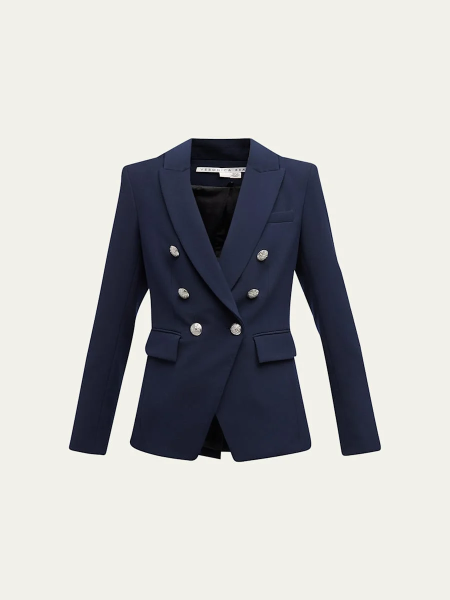 Veronica Beard "Miller" dickey jacket. Approx. measurements: Sleeve length 32 3/4"; Length 26" Compatible with all Veronica Beard dickeys (sold separately). Peak lapels; doublebreasted front. Long sleeves; button cuffs. Chest welt pocket. Side flap pockets. Tailored fit. Vented back. Polyester. Professional dry clean only Made in the USA