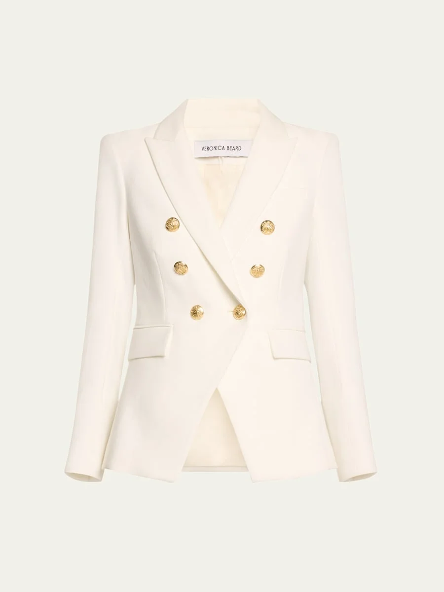 Veronica Beard "Miller" dickey jacket. Approx. measurements: Sleeve length 32 3/4"; Length 26" Compatible with all Veronica Beard dickeys (sold separately). Peak lapels; doublebreasted front. Long sleeves; button cuffs. Chest welt pocket. Side flap pockets. Tailored fit. Vented back. Polyester. Professional dry clean only Made in the USA