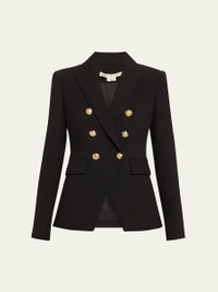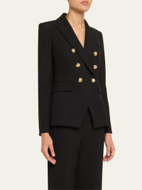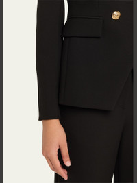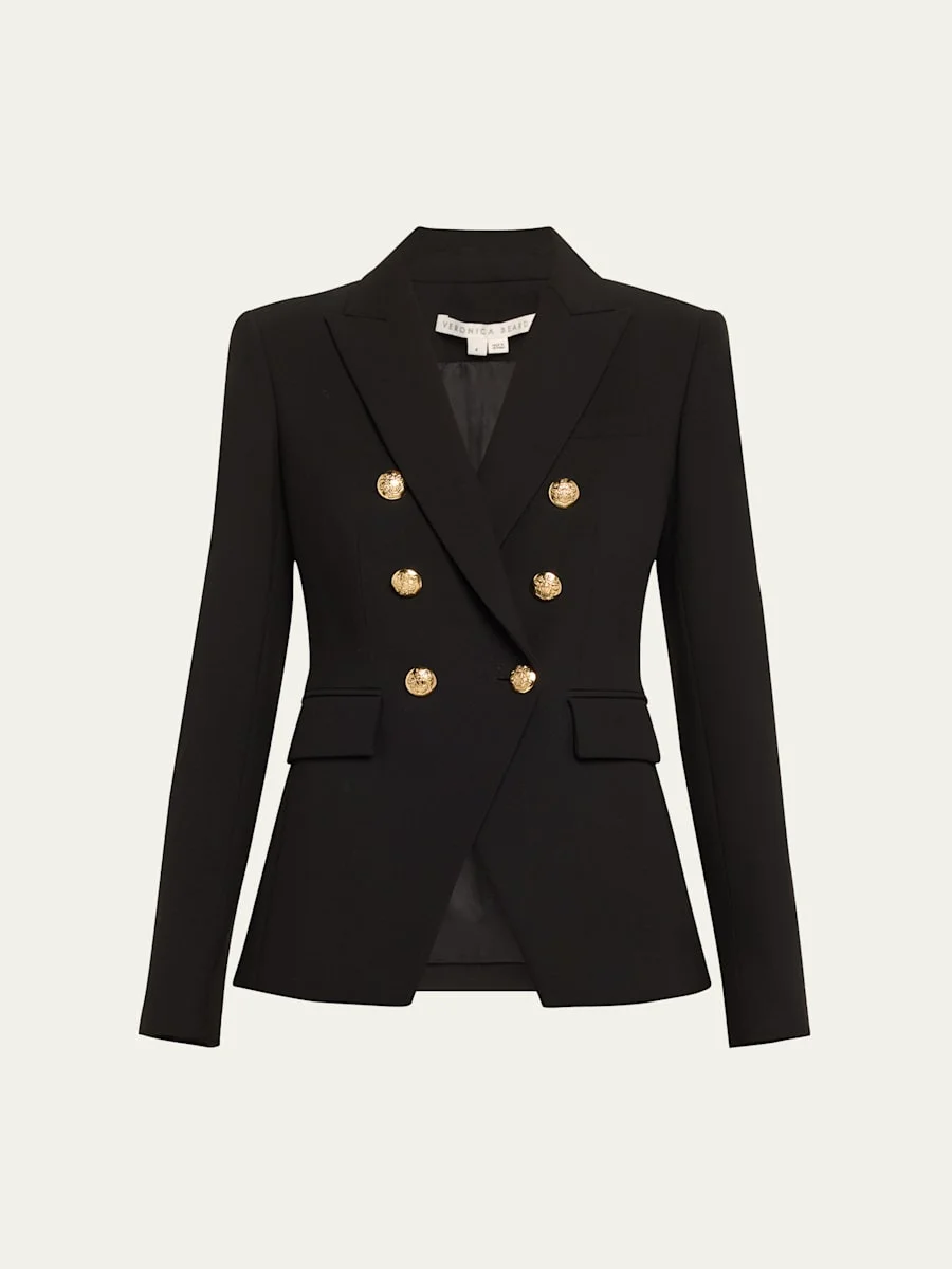 Veronica Beard "Miller" dickey jacket. Approx. measurements: Sleeve length 32 3/4"; Length 26" Compatible with all Veronica Beard dickeys (sold separately). Peak lapels; doublebreasted front. Long sleeves; button cuffs. Chest welt pocket. Side flap pockets. Tailored fit. Vented back. Polyester. Professional dry clean only Made in the USA