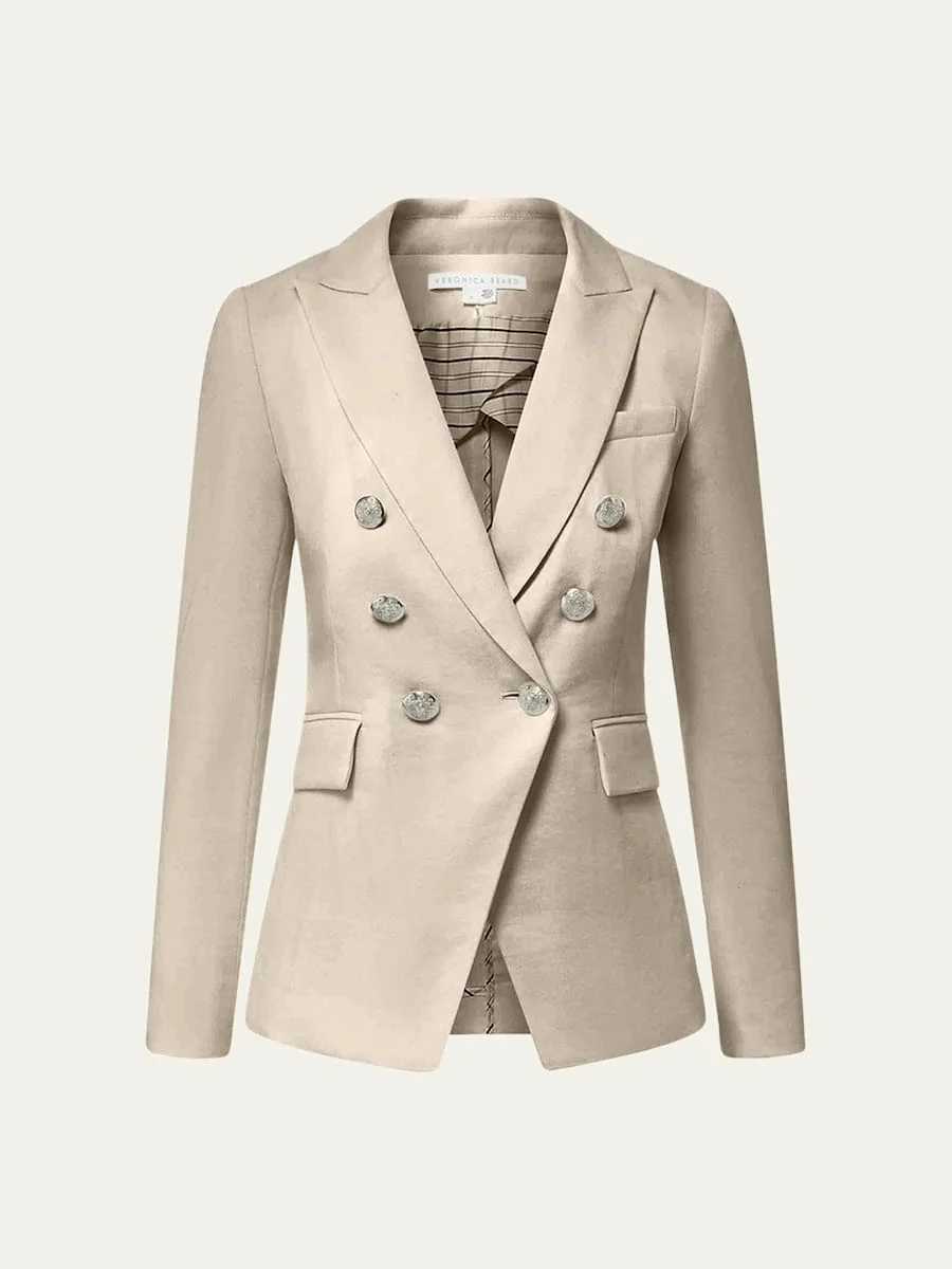 Veronica Beard "Miller" dickey jacket with gold-tone buttons Peak lapels Double-breasted front Long sleeves; button cuffs Flap and welt pockets Vented back Tailored fit Single button closure Linen Dry clean Made in USA from imported materials Model is 5'10"/177cm. Size Note: Item runs large, consider ordering a size down. Online Inquiries: BGS21_T8ZRP| Store Inquiries: #4492612