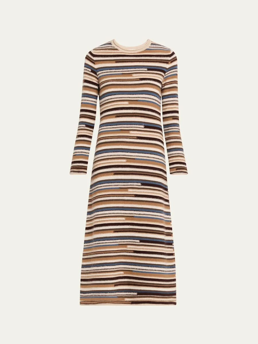 Spun from an Italian wool-cashmere blend, the "Sanders" knit dress by Veronica Beard features a horizontal striped pattern and braided rolled trim for an elevated touch Approx. 47.5"L from shoulder to hem Crew neckline Long sleeves; approx. 31"L Hem falls below the knee A-line silhouette Slipover style Wool/cashmere/mohair Unlined Dry clean Imported Online Inquiries: BGS21_T87DG| Store Inquiries: #5247780