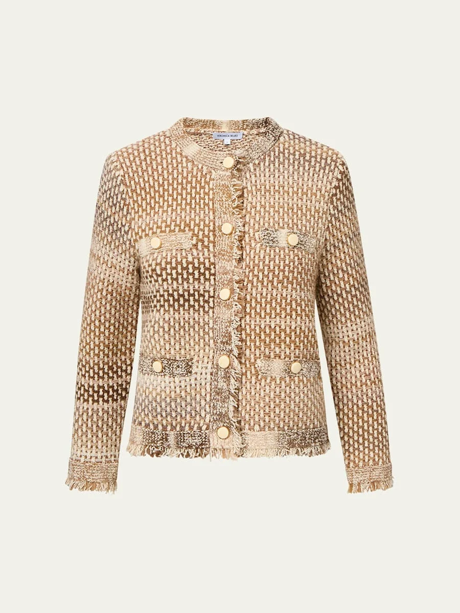 Crafted in a tweed-inspired knit, the "Sariyah" jacket by Veronica Beard features a tailored silhouette with fringed trim for an easy, yet polished look. Round neckline Long sleeves Buttoned welt pockets Tailored fit Hem sits at the hip Button-front Cotton/acrylic/polyester Dry clean Made in Italy Online Inquiries: BGS21_T8QFF| Store Inquiries: #5357605