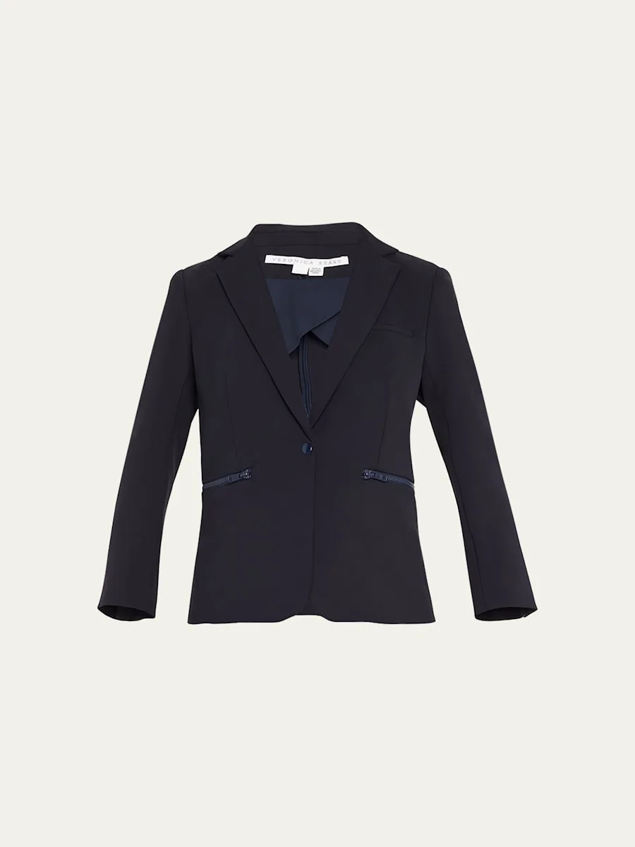 Veronica Beard "Scuba Schoolboy" blazer Approx. 23.3"L down center back. Notched collar; one-snap front. Three-quarter sleeves. Zip and welt pockets Tailored fit Cutaway hem Nylon/spandex. Dry clean. Made in USA of imported material. Sizing Note: Item runs small, consider ordering a size up. Online Inquiries: BGS21_TXB84| Store Inquiries: #2662080