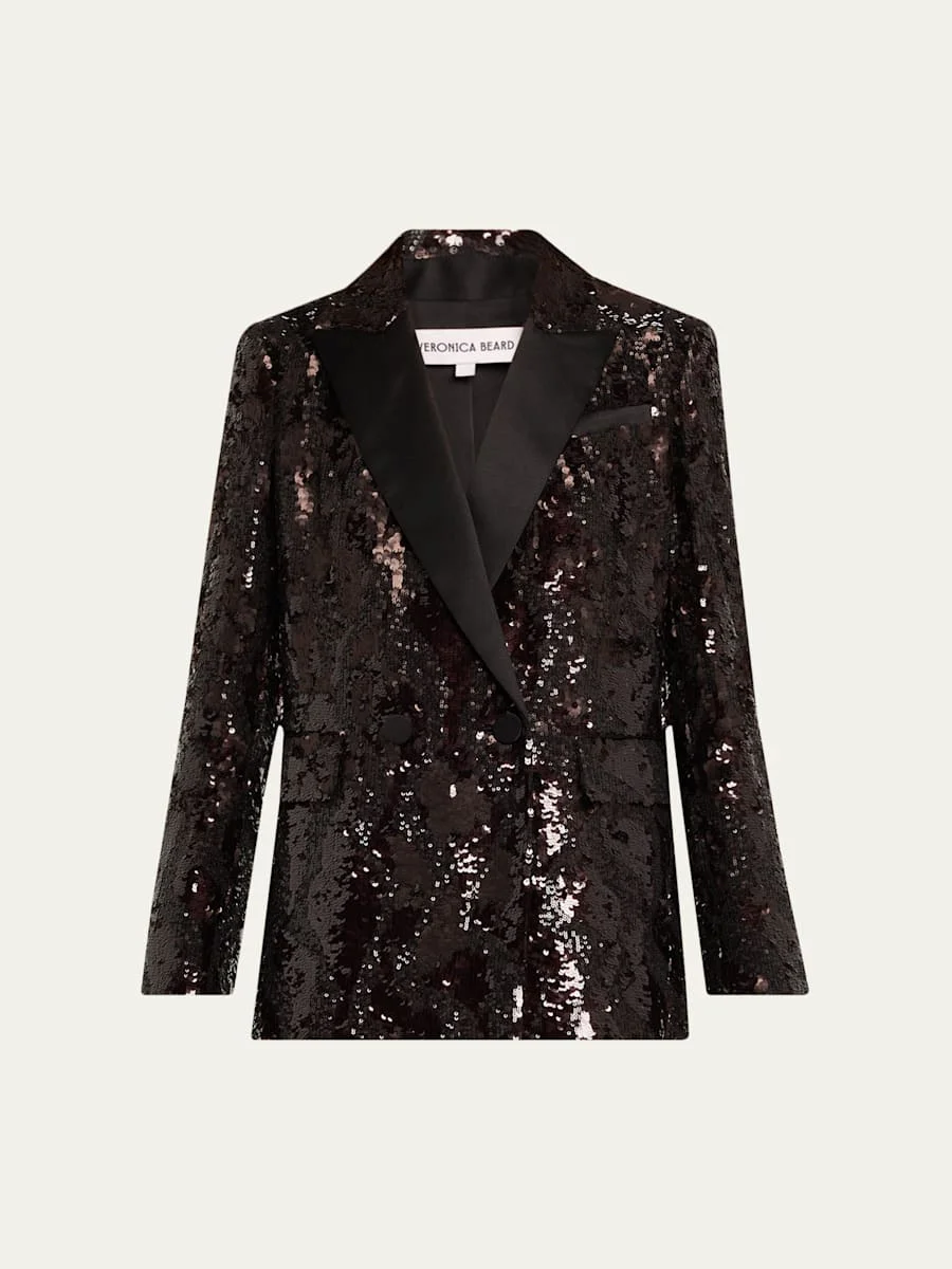 Elegance and glamour meet in the "Sevyn" jacket by Veronica Beard, featuring sequin embellishment and satin trim. Peak lapels Double-breasted front Structured shoulders Long sleeves with button cuffs; approx. 32.5"L Chest welt pocket Hip flap pockets Tailored fit Vented back Button-front Polyester/elastane Lining: Polyester/elastane Spot clean Imported Online Inquiries: BGS21_T86R9| Store Inquiries: #5245214