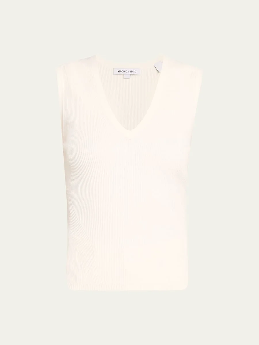 Veronica Beard "Sid" sweater in ribbed knit V neckline Sleeveless Easy fit Hem sits at the hip Pullover style Viscose/polyester Imported Model is 5'10"/177cm. Online Inquiries: BGS21_T5GCX| Store Inquiries: #4719469