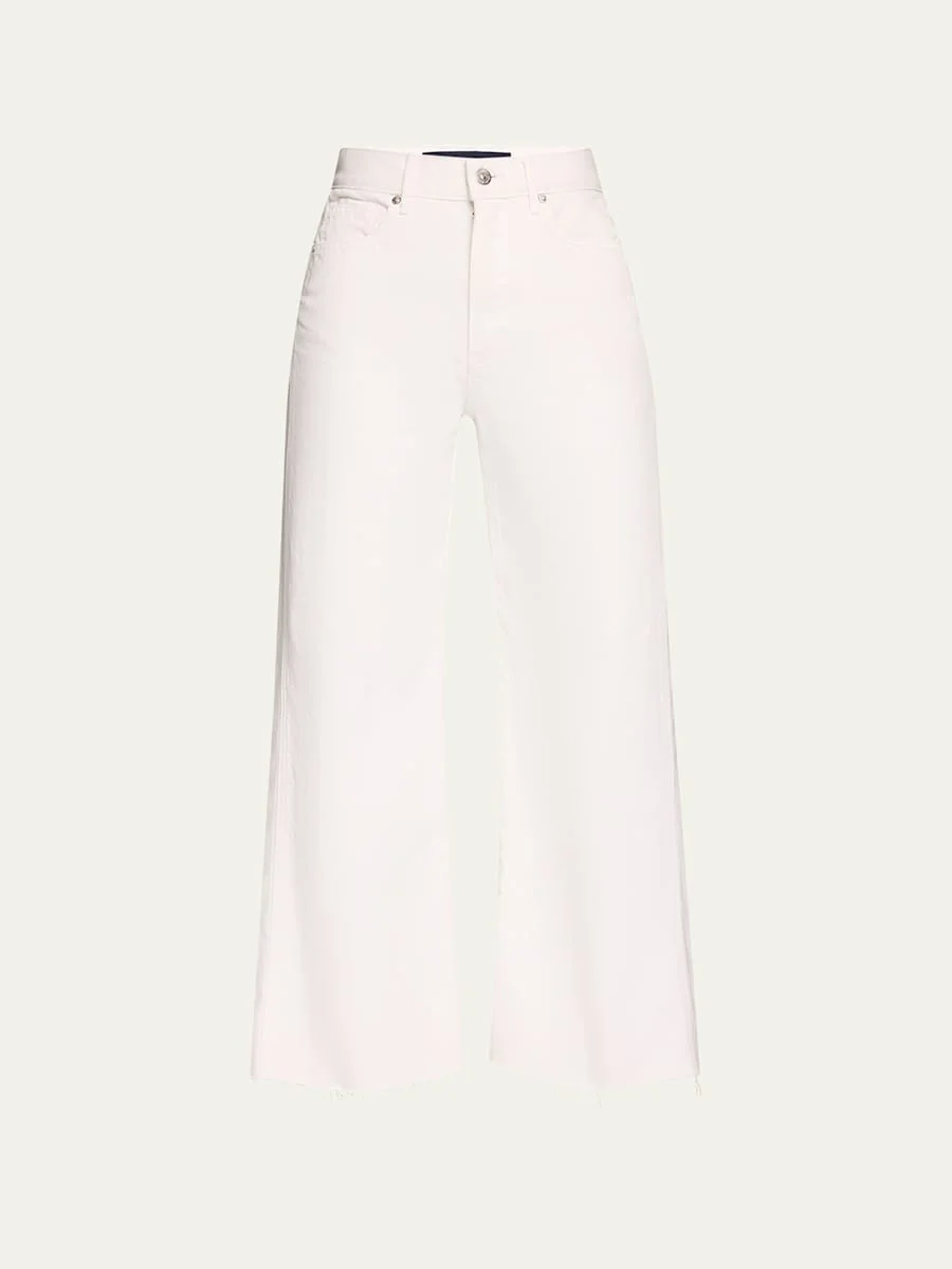Veronica Beard "Taylor" jeans featuring a raw hem in white denim Approx. 12" rise; 27" inseam High rise Five-pocket style Wide legs Cropped length Button/zip fly; belt loops Cotton Machine wash cold Made in USA from imported materials Online Inquiries: BGS21_T6429| Store Inquiries: #4898531