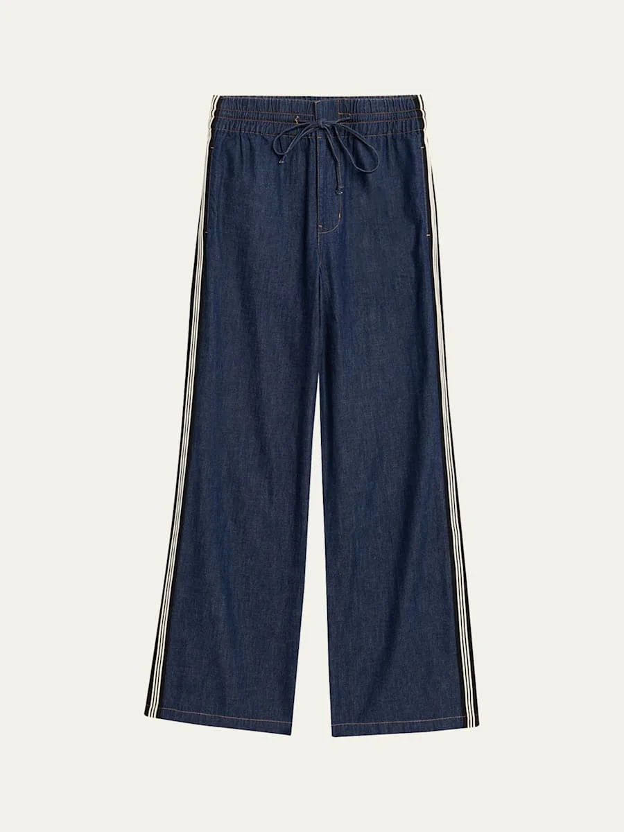 Crafted from premium denim, the "Taylor" jeans by Veronica Beard are accented with contrast side stripes and an elastic waistband for a modern take on elevated athleticwear. Approx. 11" rise; 32" inseam High rise Drawstring waistband Side seam pockets; back welt pockets Wide legs Full length Pullon style Wide Cotton Machine wash cold or dry clean Imported