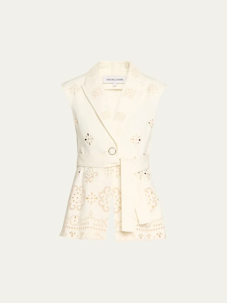 Accented with intricate eyelet embroidery, the "Townes" vest by Veronica Beard is crafted from crisp cotton twill and finished with delicate scalloped trim, creating a chic silhouette perfect for springtosummer styling. Peak lapels Singlebreasted front Sleeveless Selftie belt Slim fit Cutaway hem Buttonfront Cotton/elastane Lining: Polyester Dry clean only Imported SIZE amp; FITModel measurements: 5'10" tall Model is wearing a US size 4/Small